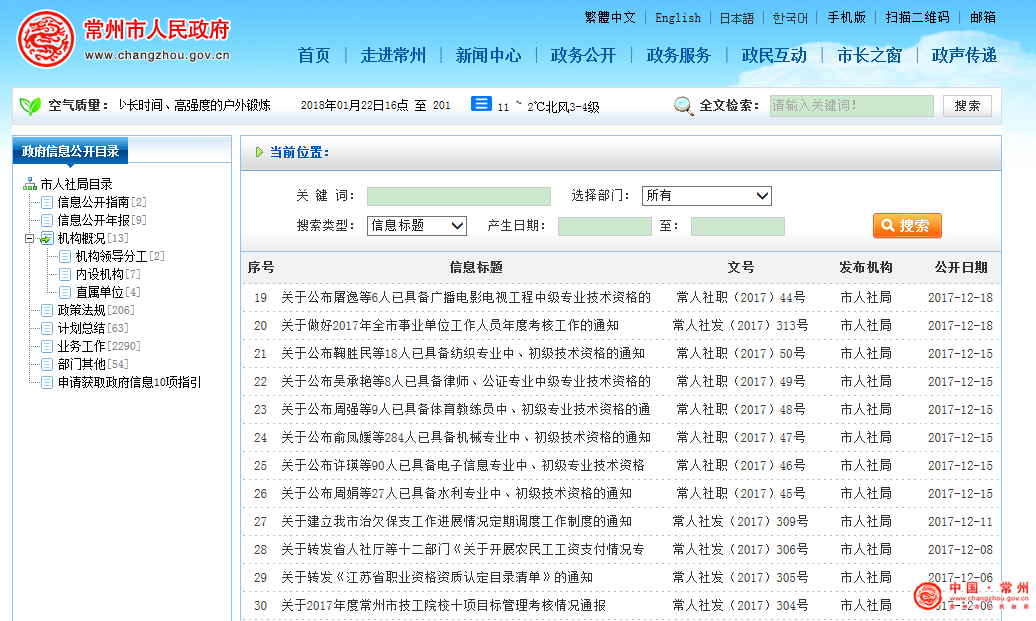 常州市人社局政府信息主動(dòng)公開(kāi)的范圍為:人社局主要職能、服務(wù)項(xiàng)目、辦事制度、辦事程序、辦事時(shí)限及監(jiān)督途徑;人社局年度工作目標(biāo)及執(zhí)行情況;人社局制定的涉及人民群眾利益的重要人事人才、勞動(dòng)保障政策規(guī)定及事關(guān)全市各類人才發(fā)展、勞動(dòng)關(guān)系、社會(huì)保障的重大決策部署、權(quán)利事項(xiàng)和實(shí)施情況等。