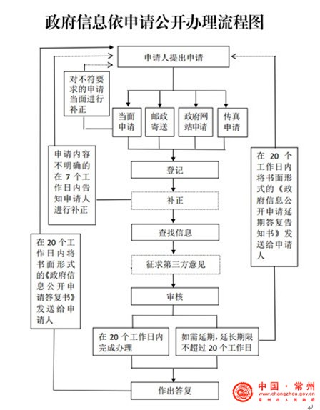 3、在線申請:申請人進入常州市人民政府門戶網(wǎng)站首頁-“政務公開”欄目-“依申請公開”頁面,在線填寫電子版《常州市人民政府信息公開申請表》提交申請。