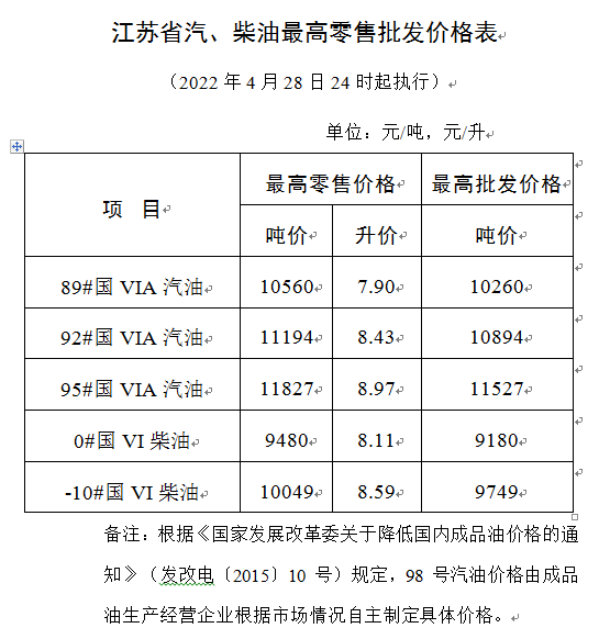 根據(jù)國家發(fā)展改革委公布的國內(nèi)成品油價(jià)格調(diào)價(jià)信息,現(xiàn)將我省汽、柴油最高零售、批發(fā)價(jià)格公布如下,自2022年4月28日24時(shí)起執(zhí)行。