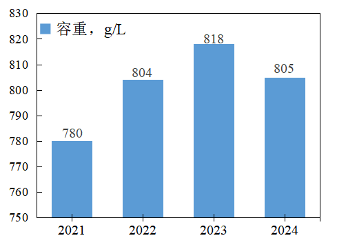 容重最高868 g/L,最低750 g/L,平均容重805 g/L(去年平均容重787 g/L)。根據(jù)分等占比表(見表3),一等小麥占比75%,二等小麥占比12.5%,三等小麥占比12.5%。
