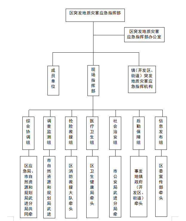 區(qū)突發(fā)地質(zhì)災害應對組織體系由區(qū)應急指揮機構(gòu)、辦事機構(gòu)、現(xiàn)場指揮部及專家組等組成。