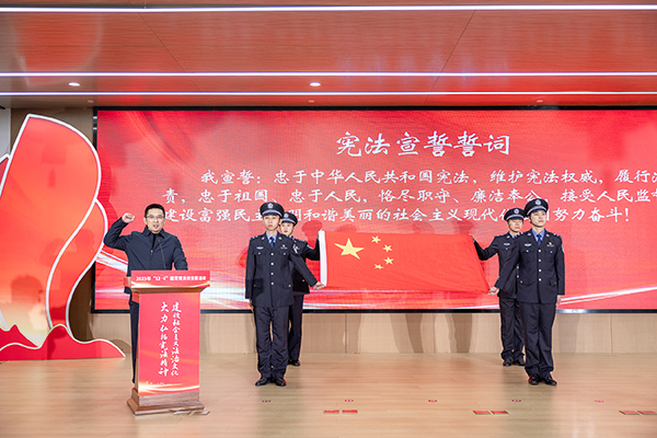 “我宣誓,忠于中華人民共和國憲法,維護憲法權(quán)威,履行法定職責(zé)……”公職人員代表向憲法莊嚴(yán)宣誓,鏗鏘有力的宣誓詞在會場上空回蕩。面向國旗和憲法許下的鏗鏘誓言,是初心使命的再宣示,更是接續(xù)奮斗的再出發(fā)。