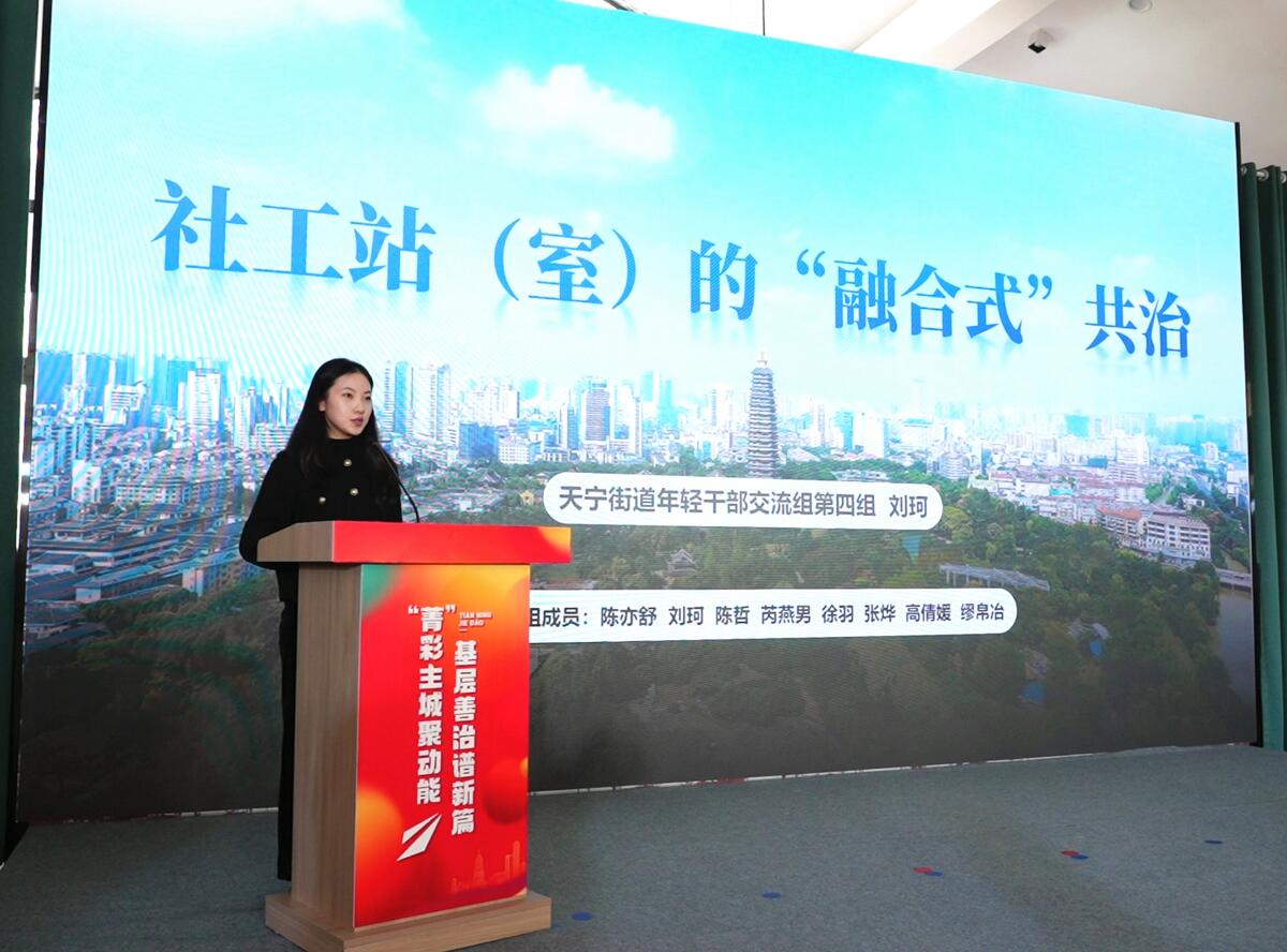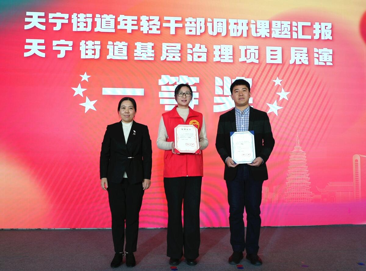 為進(jìn)一步貫徹落實(shí)新時(shí)代黨的建設(shè)總要求,建設(shè)高素質(zhì)干部隊(duì)伍,深化黨建引領(lǐng)基層社會(huì)治理,1月4日上午,天寧街道舉辦“菁”彩主城聚動(dòng)能 基層善治譜新篇——年輕干部調(diào)研課題匯報(bào)、基層治理項(xiàng)目展演活動(dòng),推動(dòng)主題教育走深走實(shí)、見(jiàn)行見(jiàn)效。天寧區(qū)政府副區(qū)長(zhǎng)吳小紅,天寧區(qū)委組織部副部長(zhǎng)、公務(wù)員局局長(zhǎng)王香平,天寧區(qū)民政局黨組書記、局長(zhǎng)袁維鴻,天寧區(qū)天寧街道黨工委副書記、辦事處主任錢濱,常州市總工會(huì)基層工作部副部長(zhǎng)王一博,天寧區(qū)委主題教育第五聯(lián)絡(luò)組副組長(zhǎng)李虹參加活動(dòng)。